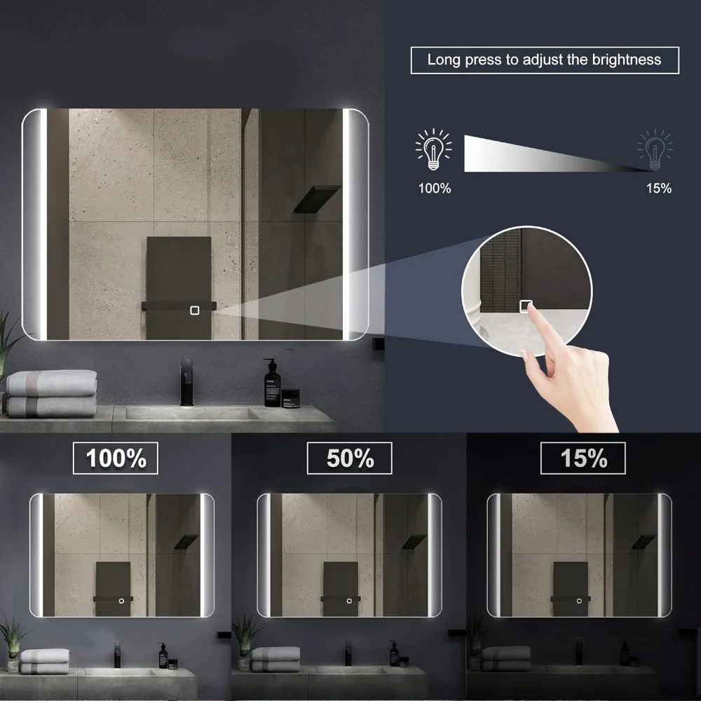 - ✔DIMMABLE & MEMORY: The brightness of this modern mirror is dimmable, touch the light button for 1 second to turn the mirror light on/off. Long press the touch switch to adjust the brightness of the mirror (10%-100%). When the LED mirror is restarted after a power failure, it will return to the last use without having to adjust again. Double-click the switch twice and the image automatically becomes the brightest.